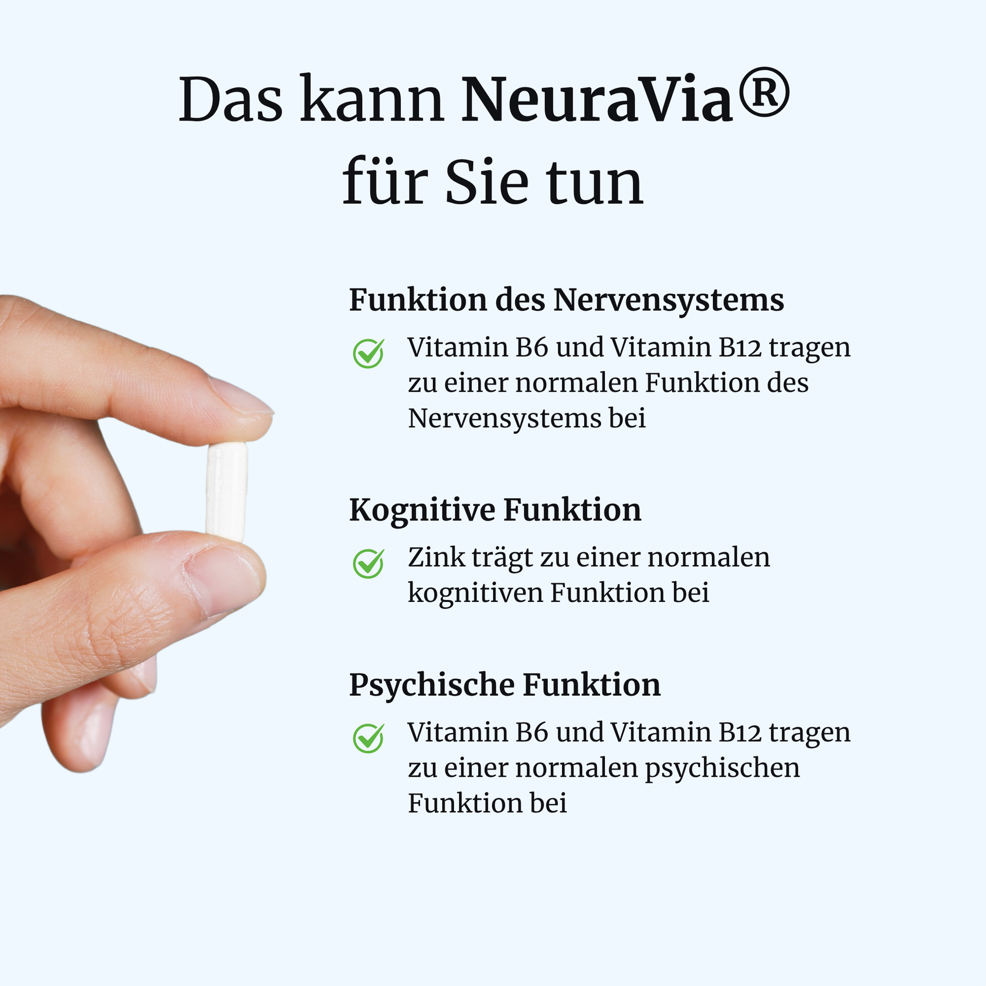 *Alle gesundheitsbezogenen Angaben beziehen sich ausschließlich auf die in NeuraVia® enthaltenen Mikronährstoffe im Rahmen der von der EFSA zugelassenen Health Claims.