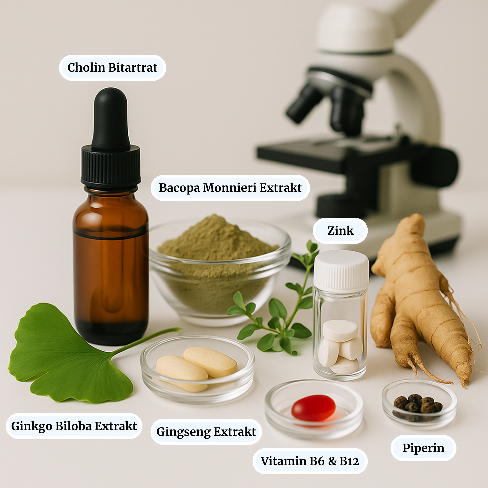 Bewährte Pflanzenextrakte wie Ginkgo, Bacopa und Ginseng kombiniert mit Cholin sowie den Mikronährstoffen Vitamin B6, Vitamin B12 und Zink – für eine ganzheitliche Unterstützung von Gedächtnis, Nervensystem und kognitiver Funktion.*